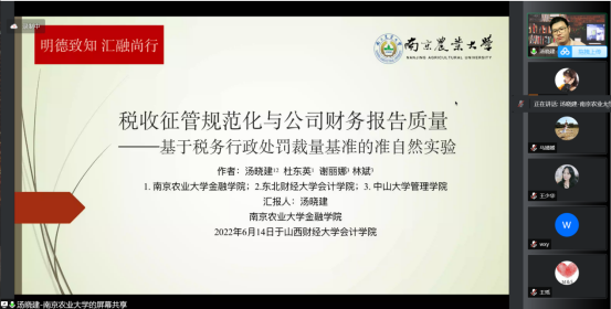 2022年6月14日,TYC234CC太阳成集团举行了第157次学术论坛,由南京农业大学汤晓健博士做学术报告:税收征管规范化与公司财务报告质量。