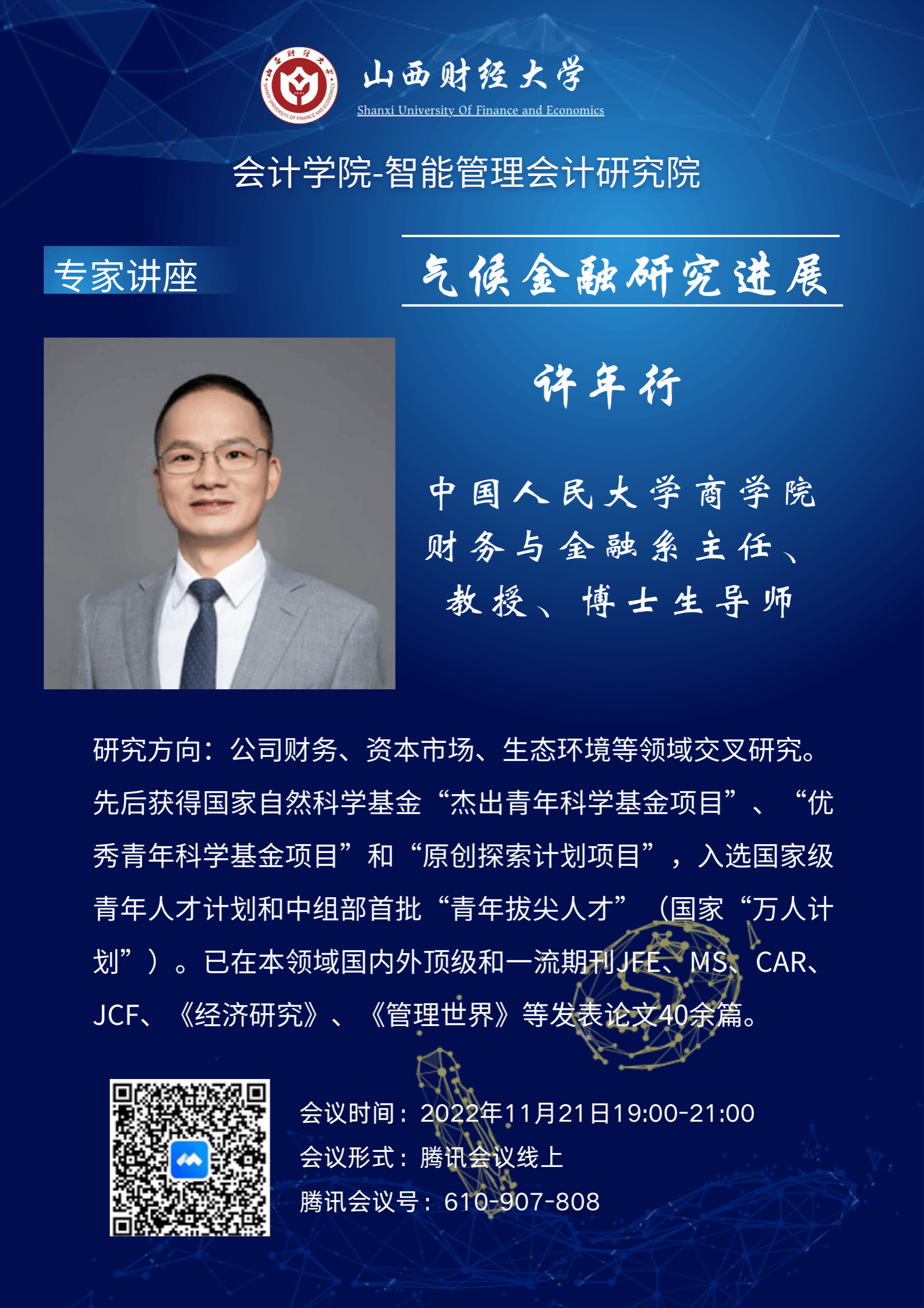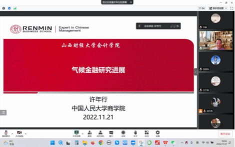 2022年11月21日晚上7:00-9:30点,TYC234CC太阳成集团-智能管理会计研究院以线上会议的形式邀请了中国人民大学许年行教授做专题讲座。许教授的报告题目为《气候金融研究进展》。