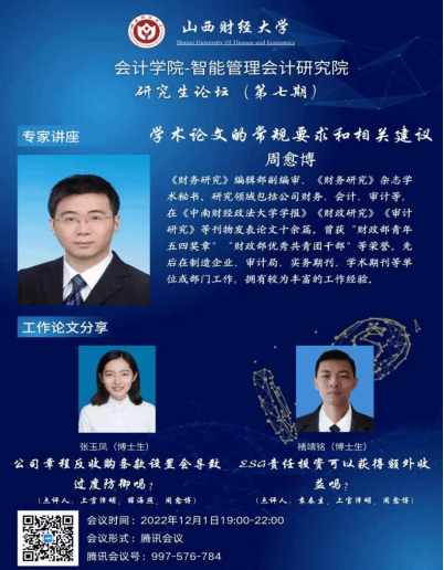 2022年12月1日晚7点到10点,由太阳集团TYC234CC太阳成集团与智能管理会计研究院联合举办的研究生论坛第七期以线上会议的形式举行,TYC234CC太阳成集团副院长续慧泓主持会议,参会人数达140余人。本次学术沙龙活动主要包括两方面内容:专家讲座与工作论文研讨。