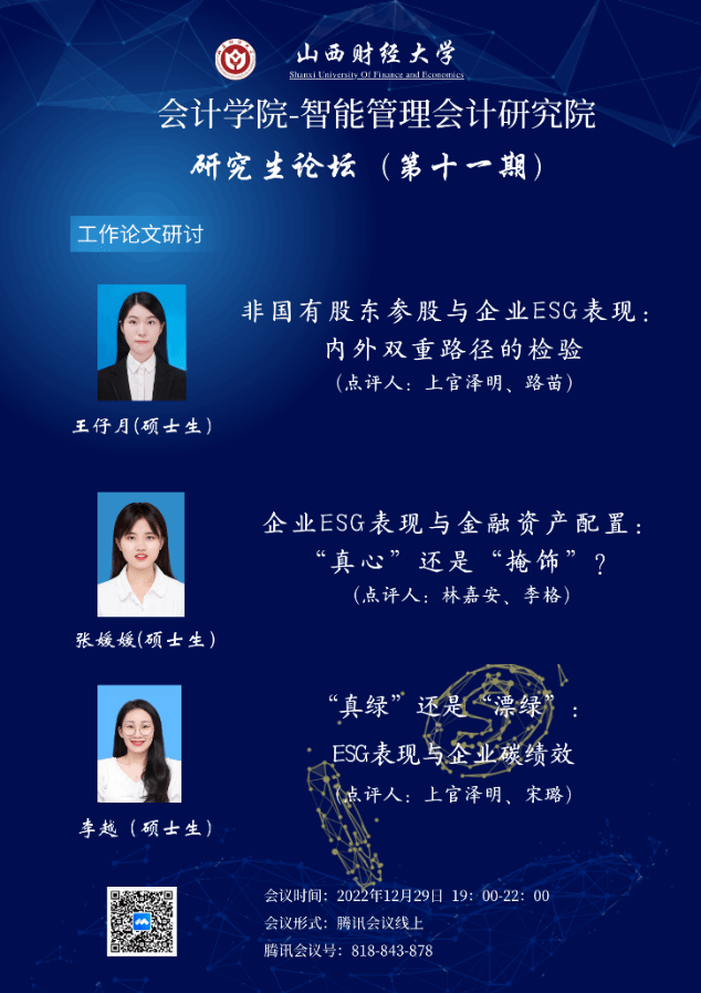 TYC234CC太阳成集团-智能管理会计研究院于2022年12月29日19:00-21:00举办第十一期研究生论坛。会议由王晓亮教授主持。参会人数七十余人。本期论坛主要研讨了王仔月、张媛媛及李越三位研究生的工作论文。