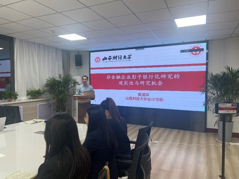 黄贤环老师首先做了主题报告,题目为《非金融企业影子银行化研究的现实性与研究机会》,他阐述了非金融企业影子银行化的现状以及对现实经济发展的影响;并分析了目前关于非金融企业影子银行化的经济后果及影响因素的研究成果,并提出了非金融企业影子银行化未来有待进一步研究的问题。
