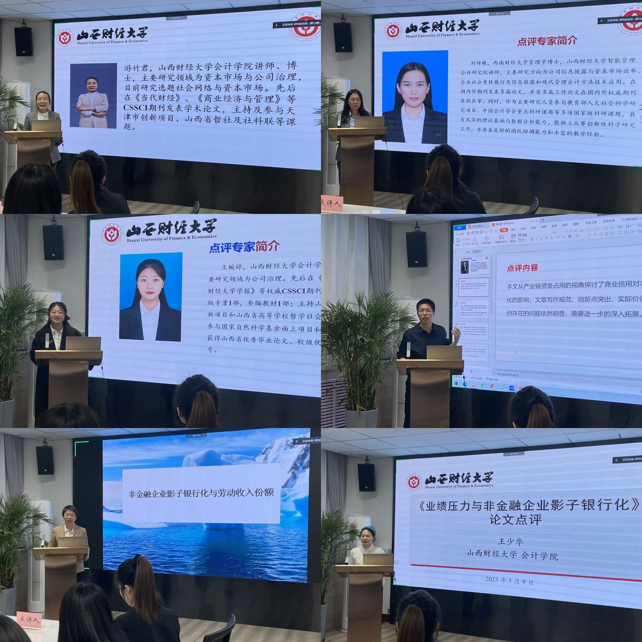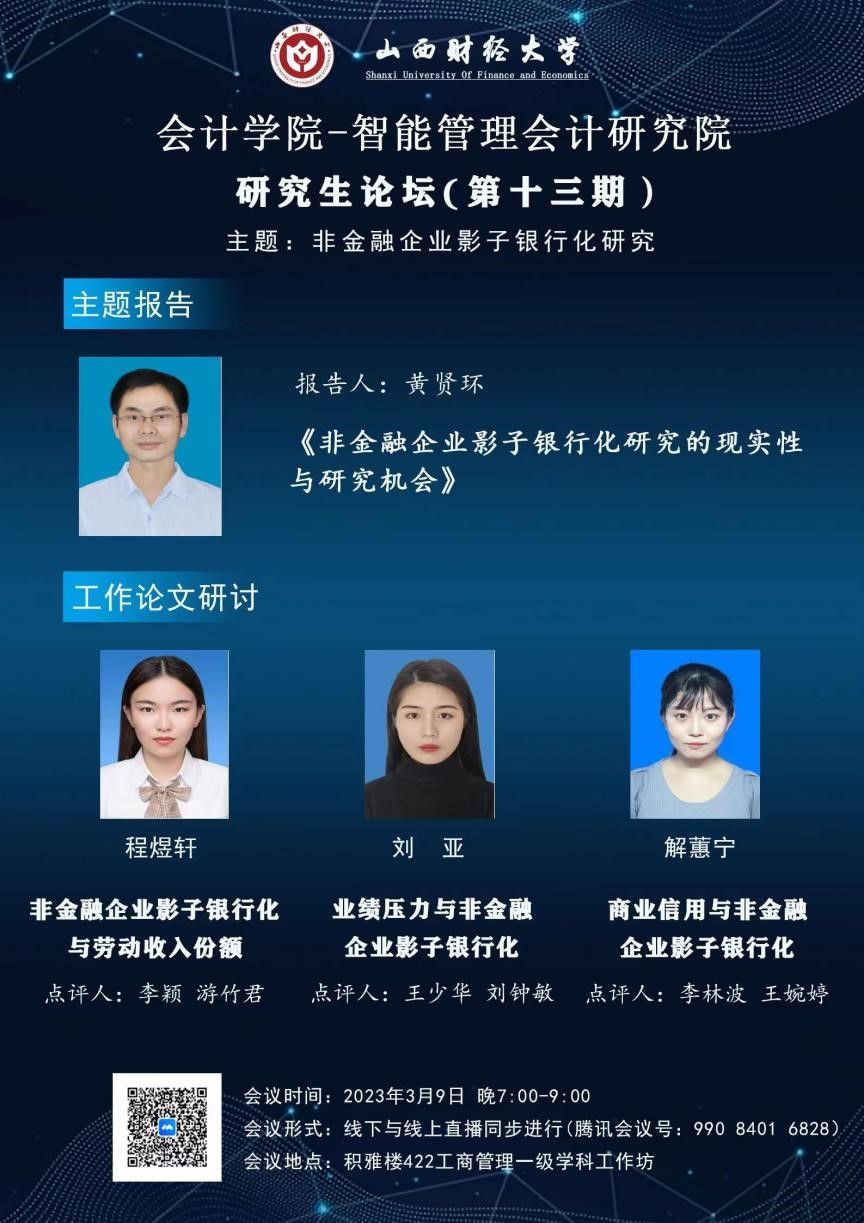 2023年3月9日晚7点到10点,由TYC234CC太阳成集团与智能管理会计研究院联合举办的研究生论坛(第十三期)以线下及线上两种形式同步举行。本次学术论坛的主题为“非金融企业影子银行化”。本期论坛的轮值主持人为黄贤环副教授。