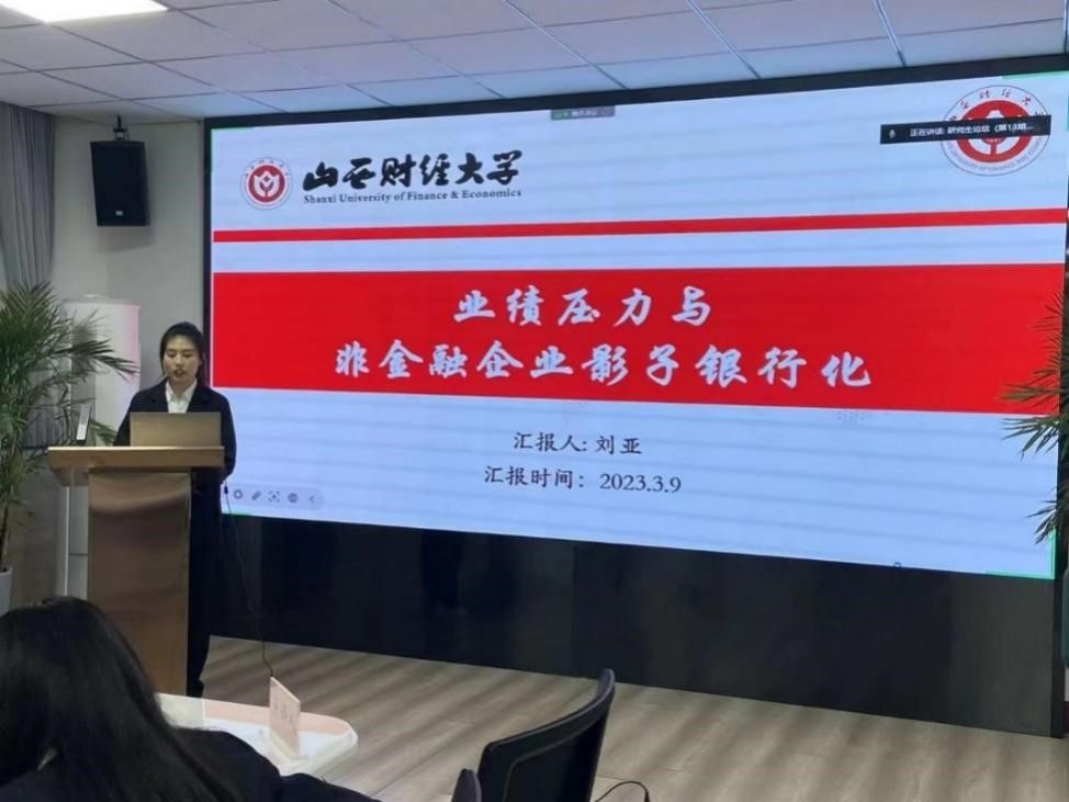 硕士生刘亚汇报了工作论文《业绩压力与非金融企业影子银行化》,王少华和刘钟敏两位老师进行了点评。王少华老师指出:论文题目的表述有待商榷;文献综述梳理不够明晰;最好能够再设计实证对另一个竞争性假设进行排除;业绩压力变量度量的合理性有待商榷;理论框架结构还可再优化;政策建议或研究启示应当基于论文的研究内容和结论出发;两个模型系数应做区分;全文样本量应保持一致。刘钟敏老师认为:文章内在假设为高管具有薪酬业绩敏感性,可做PPS检验;解释变量也偏后果性,应多做内生性检验;分组检验组间样本量差异太大;控制变量缺乏,可补充高管特征等变量进行控制。