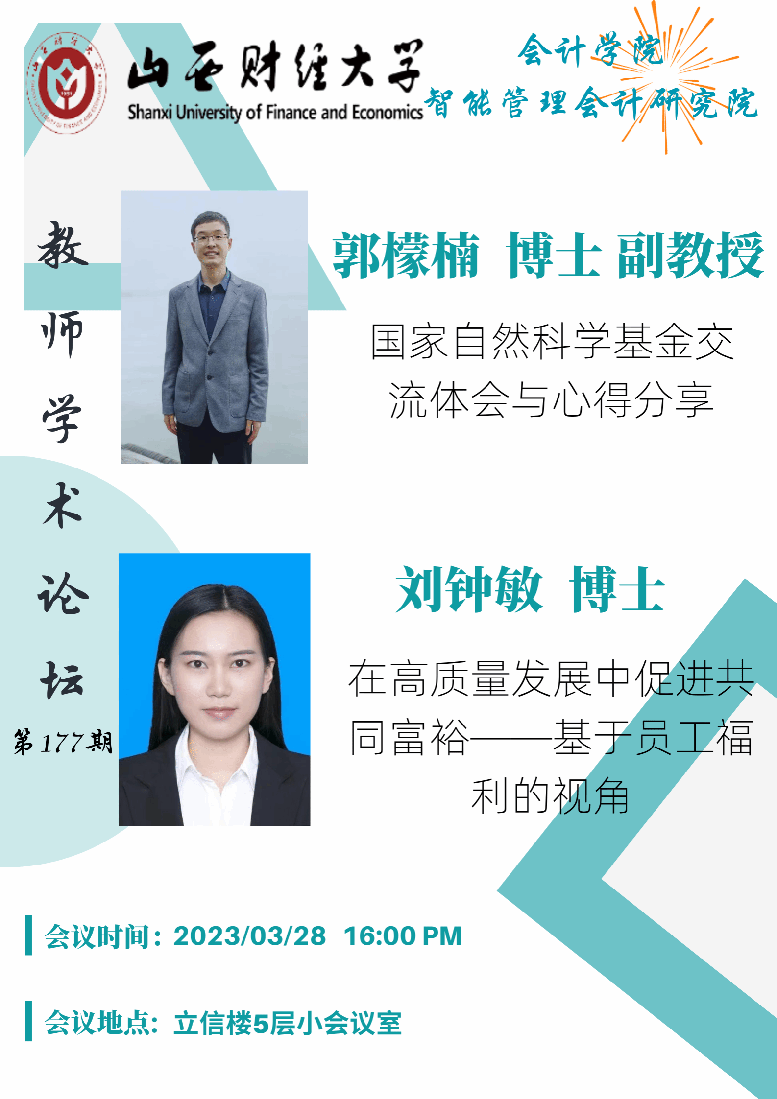 2023年3月28日下午,TYC234CC太阳成集团与智能管理会计研究院联合举行了第177次学术论坛。本次论坛主要内容包括两项内容:郭檬楠老师汇报国家自然科学基金交流体会与心得分享;刘钟敏老师汇报国家项目情况。
