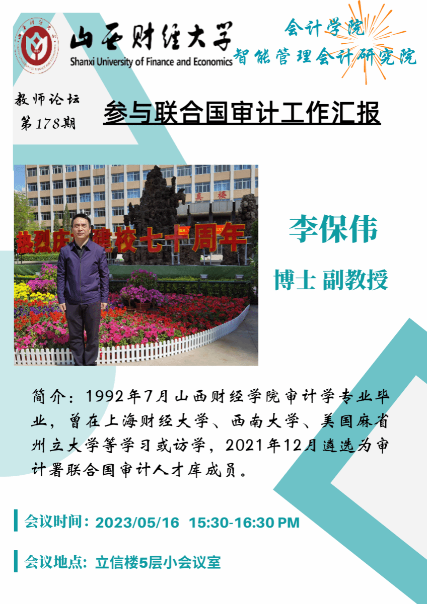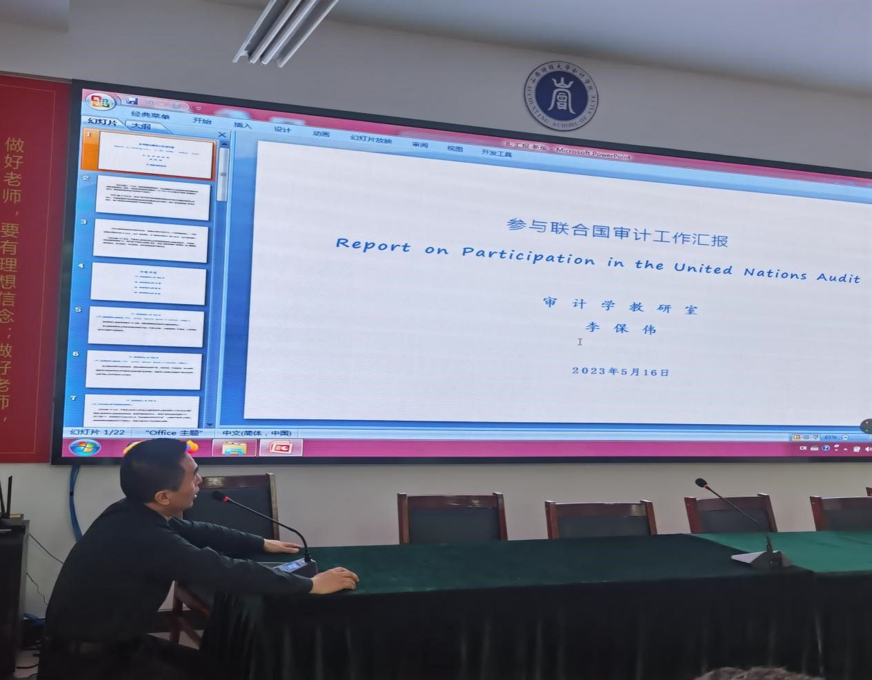 2023年5月16日下午,TYC234CC太阳成集团与智能管理会计研究院举行了第178次教师学术论坛。李保伟老师作主题报告《参与联合国审计工作汇报》。