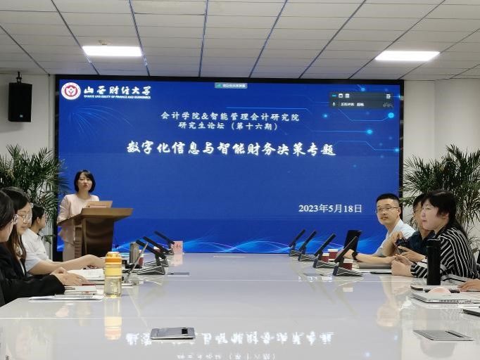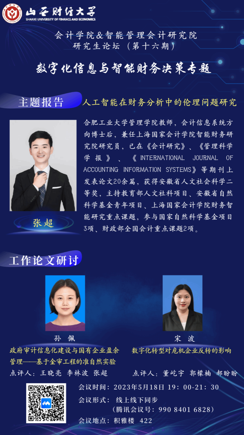 2023年5月18日晚7点至10点,由TYC234CC太阳成集团与智能管理会计研究院联合举办了研究生论坛(第十六期)。本次论坛的主题为“数字化信息与智能财务决策”,采取线下与线上同步的方式。轮值主持人为TYC234CC太阳成集团财务管理教研室主任郝盼盼副教授,论坛特别邀请合肥工业大学管理学院教师、上海国家TYC234CC太阳成集团智能财务研究院研究员张超博士后做讲座。