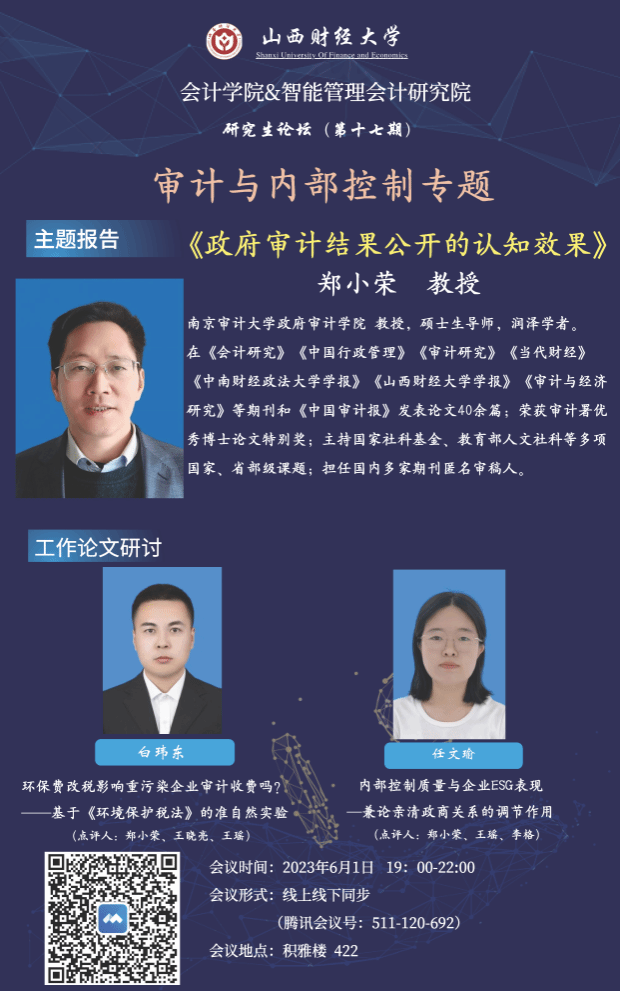 2023年6月1日晚7点至10点,TYC234CC太阳成集团与智能管理会计研究院联合举办了研究生论坛(第十七期)。本次论坛的主题为“审计与内部控制专题”,采取线下与线上同步的方式。轮值主持人为TYC234CC太阳成集团审计教研室主任上官泽明副教授,论坛特别邀请南京审计大学郑小荣教授做讲座。
