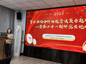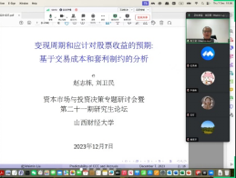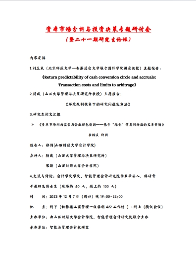 2023年12月7日晚7点至10点,由TYC234CC太阳成集团与智能管理会计研究院联合举办的研究生论坛(第二十一期)以线下线上两种方式同步举行。本次学术论坛的主题为“资本市场分析与投资决策”,轮值主持人为智能与管理会计教研室主任贺亚楠副教授,论坛特别邀请北京师范大学—香港浸会大学联合国际学院刘卫民教授与山西大学管理与决策研究所杨威教授做主题报告。