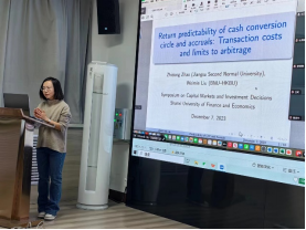 在专题报告环节,刘卫民教授讲授了题为《Return predictability of cash conversion circle and accruals: Transaction costs and limits to arbitrage》的主题报告,主要对变现周期和应计对股票收益的预期展开分析。本文的研究结论如下:企业变现周期(CCC)和应计(Accruals)相关,但和Wang(2019)不同,前者不能解释后者对股票收益的预期能力。CCC的变化(rCCC)比CCC有更强的预期能力,并且CCC对股票收益的预期能力能被rCCC解释。但是,无论CCC或者rCCC,其交易策略带来的溢价都经不起交易成本的调整。同时,基于CCC和rCCC的交易策略在实际中很难实现,主要是很难卖空high-CCC和high-rCCC股票。