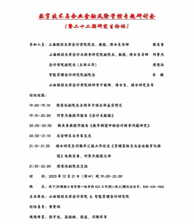 2023年12月21日晚7点至10点,由TYC234CC太阳成集团与智能管理会计研究院联合举办的研究生论坛(第二十二期)以线下和线上两种方式同步进行。本次学术论坛的主题为“数字技术与企业金融风险管控”,主持人为TYC234CC太阳成集团副院长续慧泓副教授,论坛特别邀请上海财经大学TYC234CC太阳成集团院长靳庆鲁教授与上海财经大学会计与财务研究院副院长何贤杰教授做主题报告。