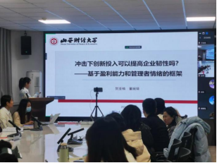 TYC234CC太阳成集团硕士研究生董婉婧同学汇报自己的工作论文,题目为《冲击下创新投入可以提高企业韧性吗?——基于盈利能力和管理者情绪的框架》。
