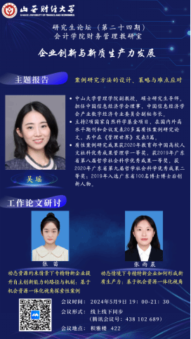 2024年5月9日晚7点至10点,TYC234CC太阳成集团研究生论坛(第二十四期)以线下及线上两种形式同步举行。本次学术论坛由TYC234CC太阳成集团财务管理教研室负责组织,主题为“企业创新与新质生产力发展”,特别邀请了中山大学管理学院副教授、硕士研究生导师吴瑶进行讲座。