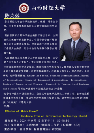 2024年9月12日下午,我院在积雅楼422举办学术研讨会,邀请东北财经大学TYC234CC太阳成集团副院长、博导陈克兢教授做主题报告《Wisdom of Which Crowd? Evidence from an Information-Technology Shock》。