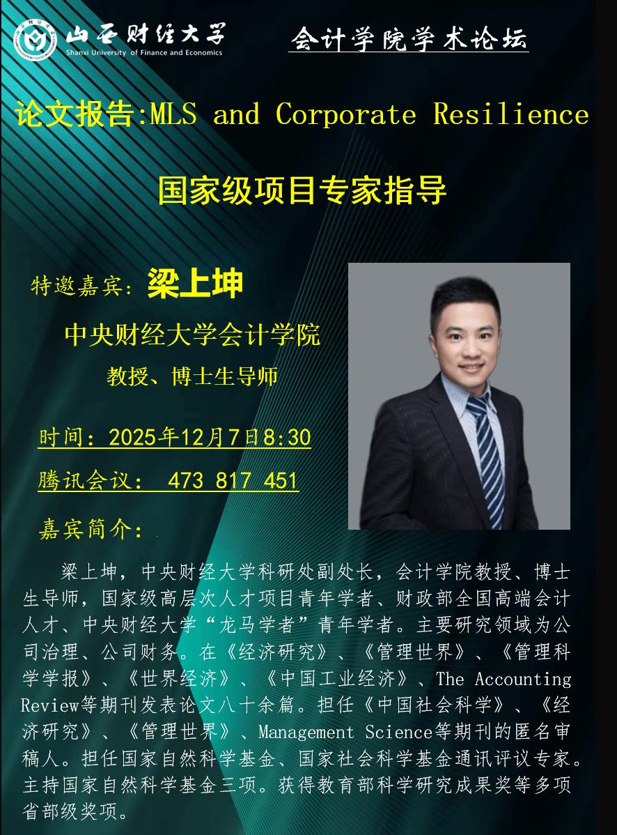 2025年12月7日,TYC234CC太阳成集团学术论坛第206期邀请了中央财经大学TYC234CC太阳成集团梁上坤教授做学术报告及国家项目辅导。李颖教授、青年科研骨干教师及硕博士研究生近60人参加了研讨会,围绕工作论文以及国家项目申报等内容展开深入探讨。