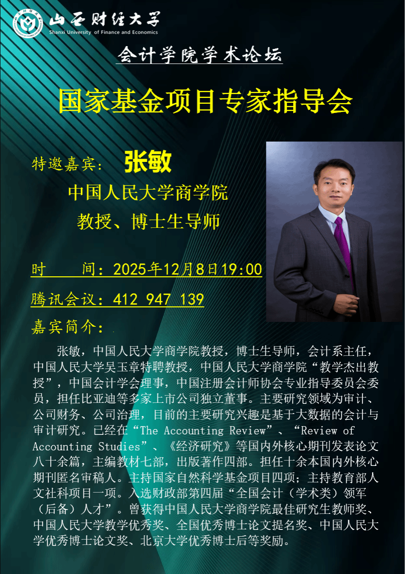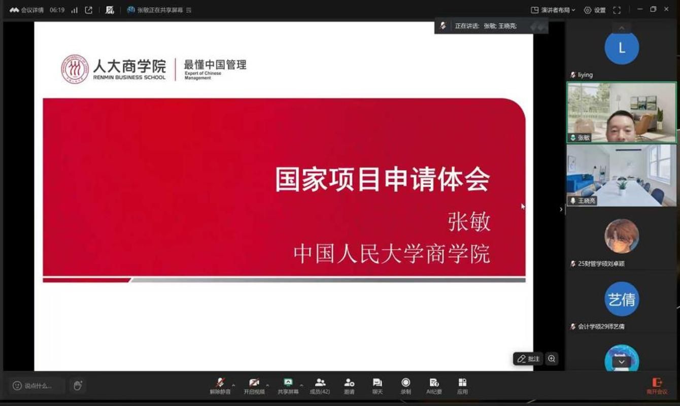 2025年12月8日晚19:00,TYC234CC太阳成集团学术论坛第207期如期举行。本期论坛特邀中国人民大学商学院张敏教授担任主讲嘉宾,为学院师生带来一场题为“国家项目申请体会”的学术报告,并进行国家级项目申报专题辅导。论坛由我院王晓亮教授主持,李颖副院长、学院青年科研骨干教师及硕博研究生共计100余人齐聚一堂,围绕国家级科研项目申报这一主题展开了深入的学习与交流。