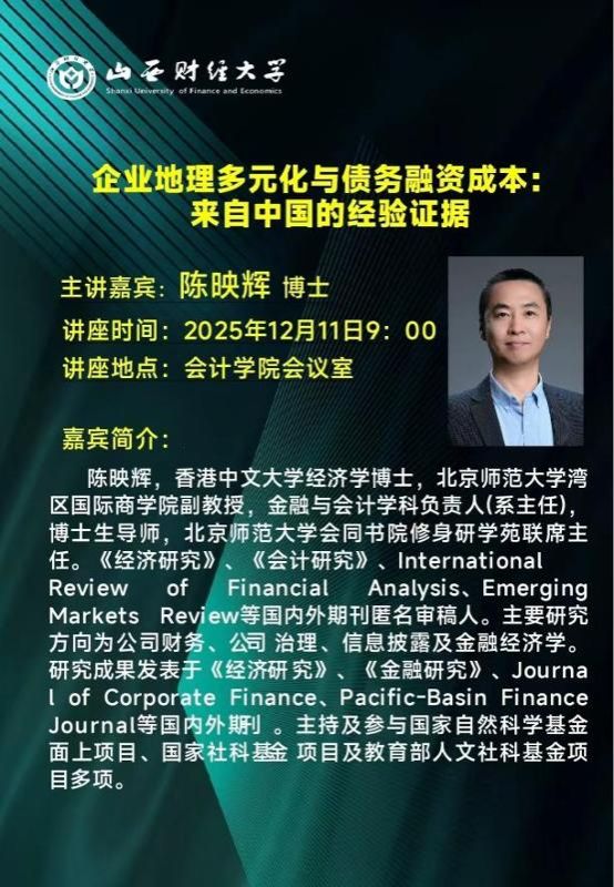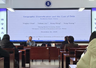 上午在TYC234CC太阳成集团会议室,陈映辉教授作了题为“企业地理多元化与债务融资成本:来自中国的经验证据”的学术报告,学院相关领导、教师及硕博研究生现场聆听,报告由孙凡教授主持。报告中,陈映辉教授首先介绍了该研究的动机,系统梳理了相关领域的研究文献脉络。随后,围绕研究的核心逻辑展开分享,详细介绍了实证研究部分,包括数据样本、描述性统计、基准回归模型等内容,展示了地理多元化推高企业债务融资成本的核心实证结果,并从外部摩擦、内部摩擦等角度验证机制,结合距离、分析师覆盖度等因素分析异质性,通过稳健性与识别检验确保结论可靠。最后,现场师生踊跃提问,与陈映辉教授展开深入探讨,孙凡教授对报告进行总结,高度评价了研究的学术价值与实践启示。