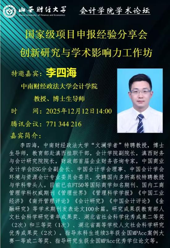 为帮助学院青年科研骨干教师及硕博研究生精准把握国家级课题申报要点,规避申报误区,提升申报质量与成功率,12月12日,我院特别邀请中南财经政法大学李四海教授担任主讲嘉宾,举办国家级课题申报经验交流分享会。