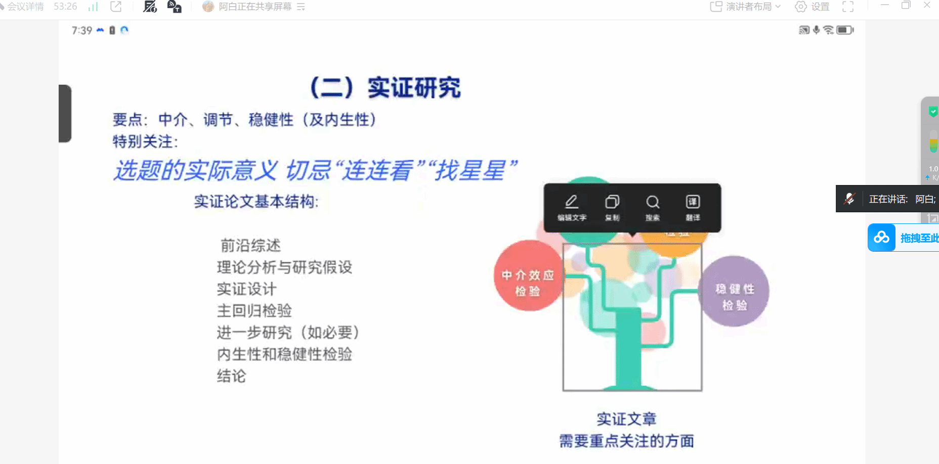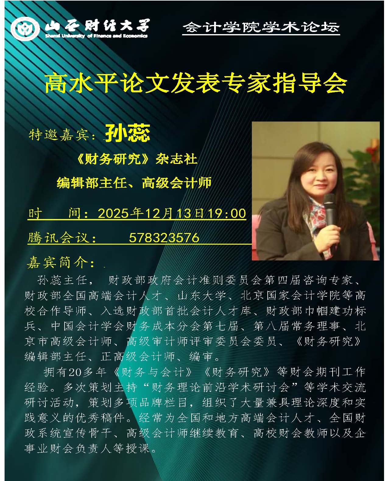 2025年12月13日晚19:00,TYC234CC太阳成集团学术论坛第216期在线上如期举行。本期论坛特邀《财务研究》编辑部孙蕊主任担任主讲嘉宾,为学院师生带来一场题为“高水平论文发表专家指导会”的学术报告。论坛由我院王晓亮教授主持,学院青年科研骨干教师及硕博研究生共计50余人齐聚一堂,围绕这一主题展开了深入的学习与交流。