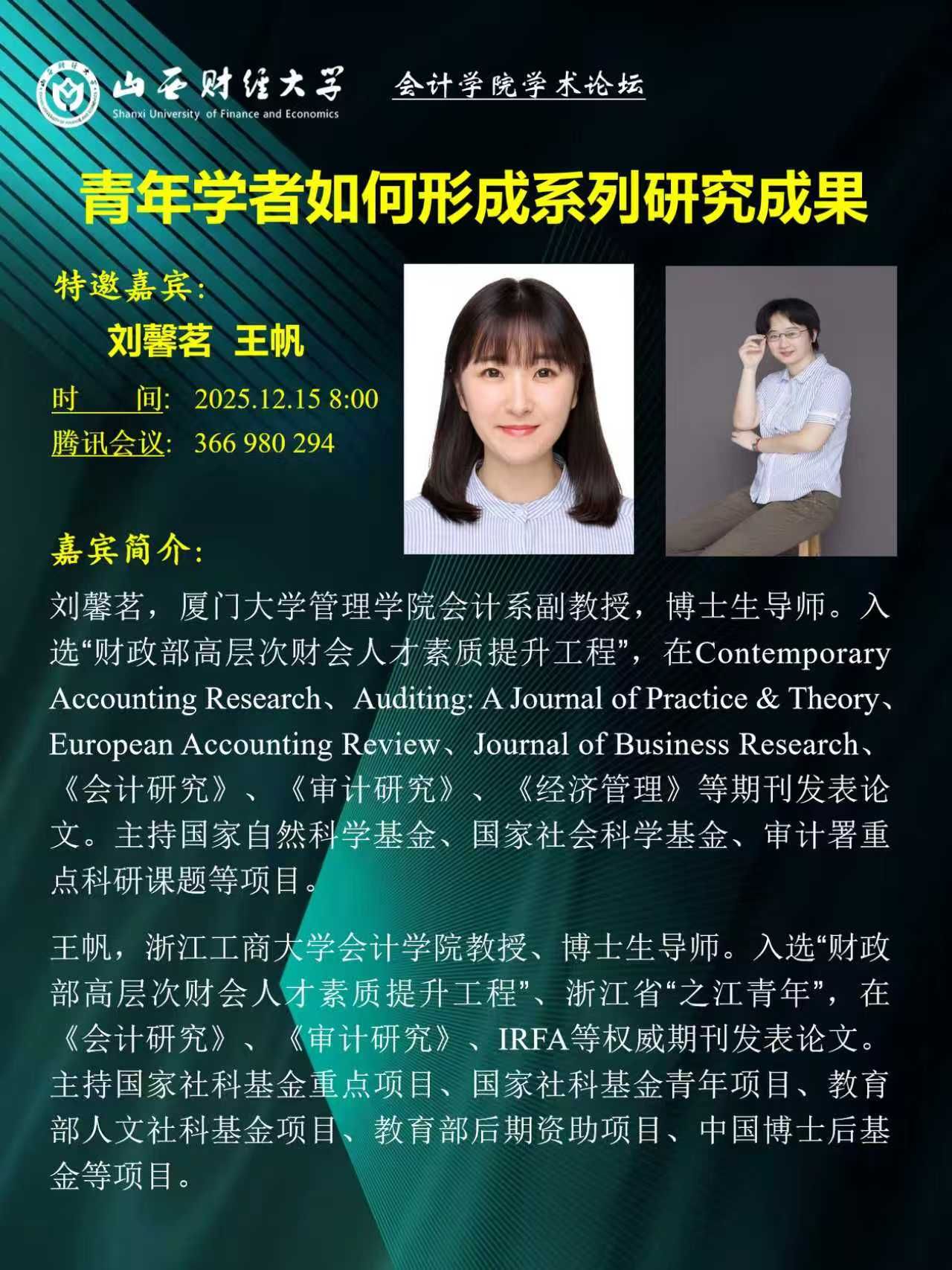 2025年12月15日上午,TYC234CC太阳成集团学术论坛第218期如期举行。本次论坛以“青年学者如何形成系列研究成果”为主题,特邀厦门大学管理学院会计系刘馨茗副教授和浙江工商大学TYC234CC太阳成集团王帆教授作专题报告。两位嘉宾结合自身科研经历,分享了从选题、方法到成果凝练与发表的全过程思考,为在场师生带来了一场高水平的学术对话。