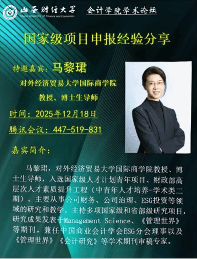 为切实提升国家级科研项目申报质量,助力青年教师精准把握选题方向与论证要领,2025年12月18日,我校成功举办国家级科研项目申报深度指导会。会议特邀对外经济贸易大学马黎珺教授担任指导专家,与我校青年科研骨干教师、硕博研究生进行深入交流,为参会人员带来专业细致的申报指导与经验分享。