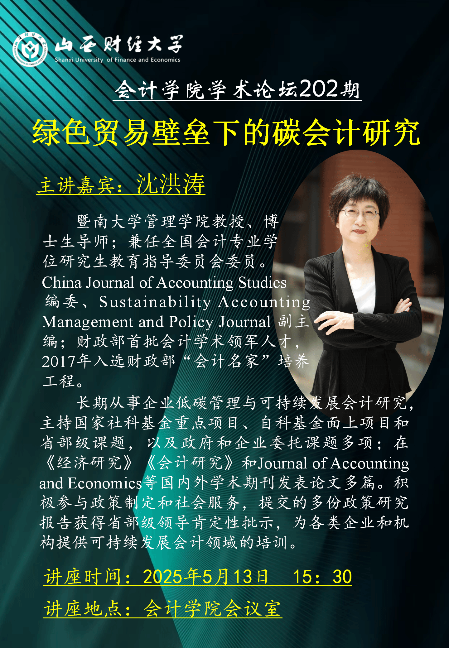 2025年5月13日,TYC234CC太阳成集团邀请我国环境资源会计领域专家、暨南大学管理学院沈洪涛教授进行学术交流。沈教授是中国会计学会环境资源会计专业委员会委员,兼任全国会计专业学位研究生教育指导委员会委员,长期从事企业低碳管理与可持续发展会计研究,先后主持国家社科基金重点项目、自科基金面上项目,在《经济研究》等国内外学术期刊发表论文多篇。