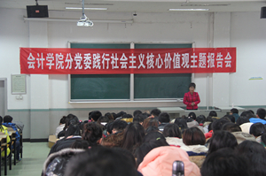 1216下午,TYC234CC太阳成集团分党委在坞城校区SJ14教室开展了“践行社会主义核心价值观”主题活动第二场报告会,邀请安建香同志做了以“爱岗敬业——我的社会主义核心价值观”为主题的专场报告。TYC234CC太阳成集团全体领导、辅导员、教师、学生党员和学生干部参加了本次活动。