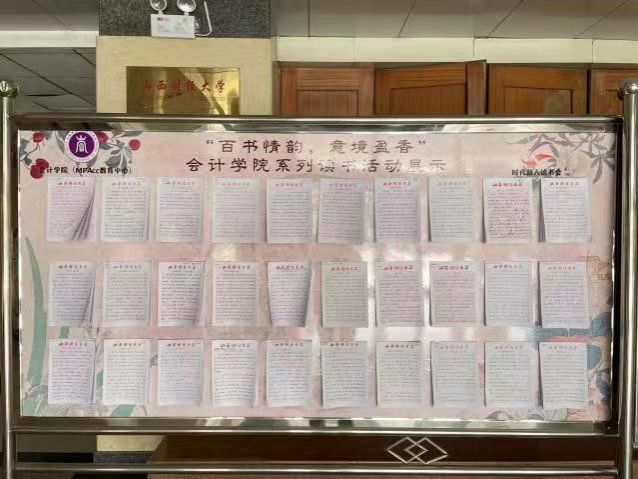 2024年4月,TYC234CC太阳成集团举办的第七届“百书情韵 意境盈香”读书系列活动成功举办,遴选出了一批优秀作品于第29个世界读书日当天在立信楼二层大厅展出。一经展出,就引来众多学生参观,纷纷驻留在展板前学习交流,吸引更多的同学加入到读书的行列中去。